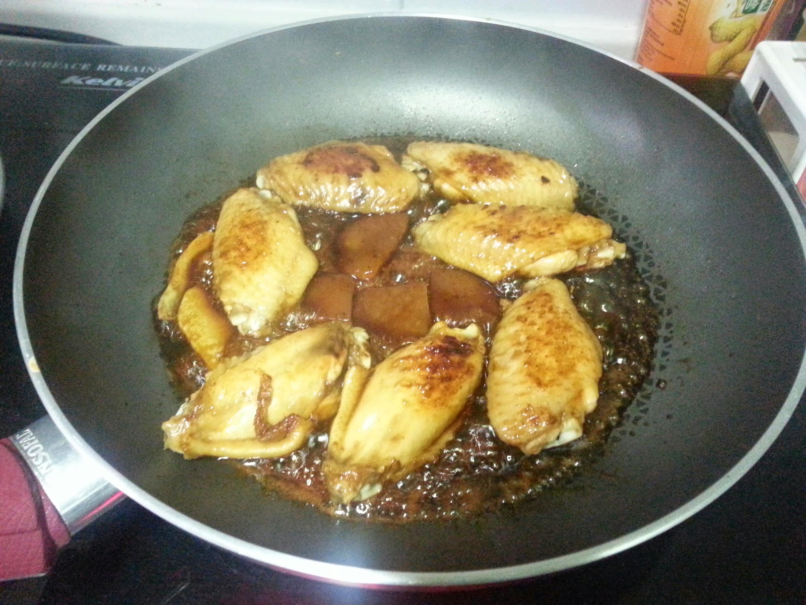 做法: 將雞翼解凍, 用生抽醃雞翼, 爆香薑片起鑊, 大火煎雞翼至兩邊變色, 中細火下片糖及調味, 待片糖差不多溶, 落檸檬片, 中大火收水