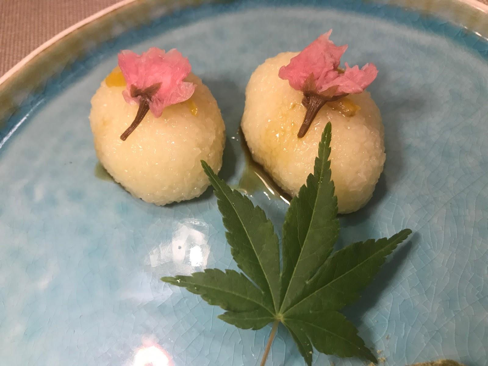 甜品分別有櫻花柚子荻餅和抹茶蕨餅, 放在一隻如湖水般的圓碟上, 賣相甚精美。